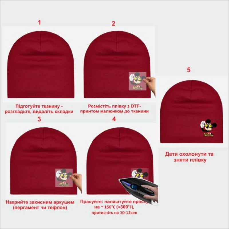 3. Термоперенесення: Готовий трансфер прикладається до тканини та під впливом високої температури та тиску за допомогою термопресу красники та клей переносяться на матеріал.